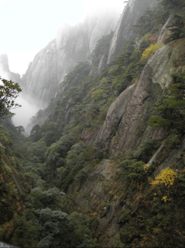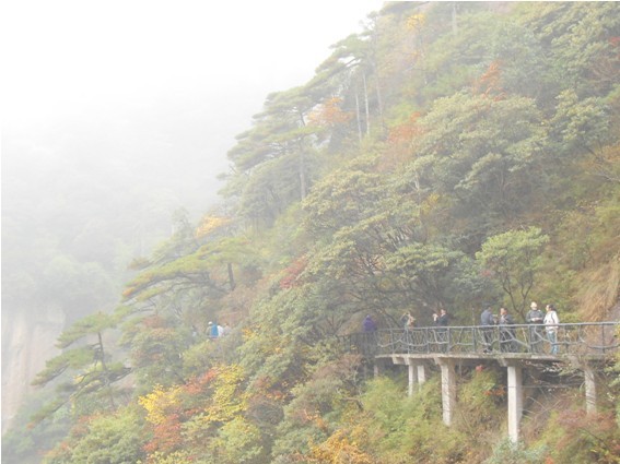 ????第二天我們游覽了江西省著名旅游景點(diǎn)-三清山。位于江西省上饒市境內(nèi),總面積有229平方公里,它由十個(gè)大的風(fēng)景區(qū)組成,其中有四個(gè)風(fēng)景區(qū)尤為著名,它們是三清宮景區(qū)、玉京峰景區(qū)、西海岸景區(qū)和南清園景區(qū)。據(jù)說三清山一年中大約有200多個(gè)霧天,云霧使千山萬(wàn)壑濃淡明滅、變幻莫測(cè),尤其在日出時(shí)分更是群峰競(jìng)秀、氣象萬(wàn)千。我們這次也沒有例外,剛開始天公盡然還下起了淅瀝小雨,坐上隧道,因?yàn)樵旗F繚繞,山完全被一層白紗遮住了,就像羞澀的新娘,將自己蓋在了頭巾里面,讓我們無(wú)法看到她的美貌。盤旋在懸崖峭壁間的高空棧道為我們觀景提供了極大好處,因?yàn)椴槐胤皆綆X,而你能如履平地的在山間信步游走。還好天公還是眷顧我們的,上山后雨不下了,就是濕氣非常的濃,三清山的面貌時(shí)隱時(shí)現(xiàn)的出現(xiàn)在我們眼前,當(dāng)郁郁蔥蔥的林木和奇峰怪石展露在我們眼前時(shí),心情無(wú)比的開闊。真是一山一景,每座山都有各自的特色,黃山給我的感覺是氣魄,真是如詞所提:“一覽眾山小”;而張家界的山又是因奇特著稱,一個(gè)個(gè)石柱拔地而起,不得不感慨大自然的偉大力量;而三清山,給我的感覺更女性化,有種少女般的羞澀和秀麗。